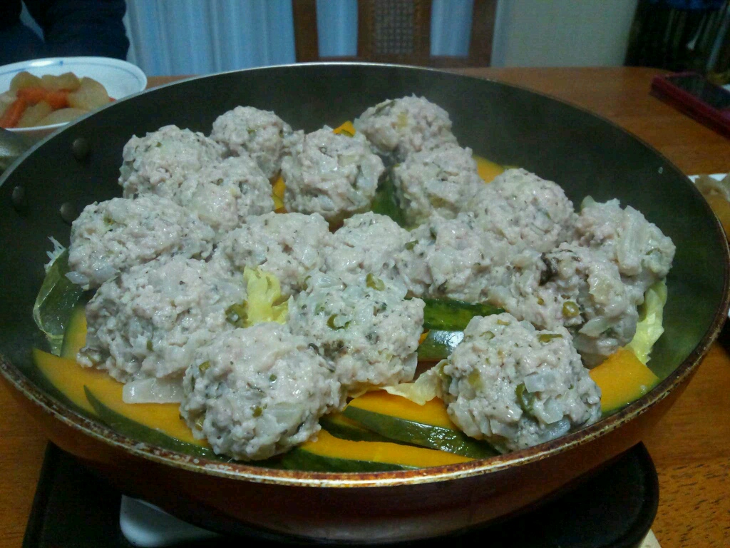 母親の鶏団子をぱくつき。