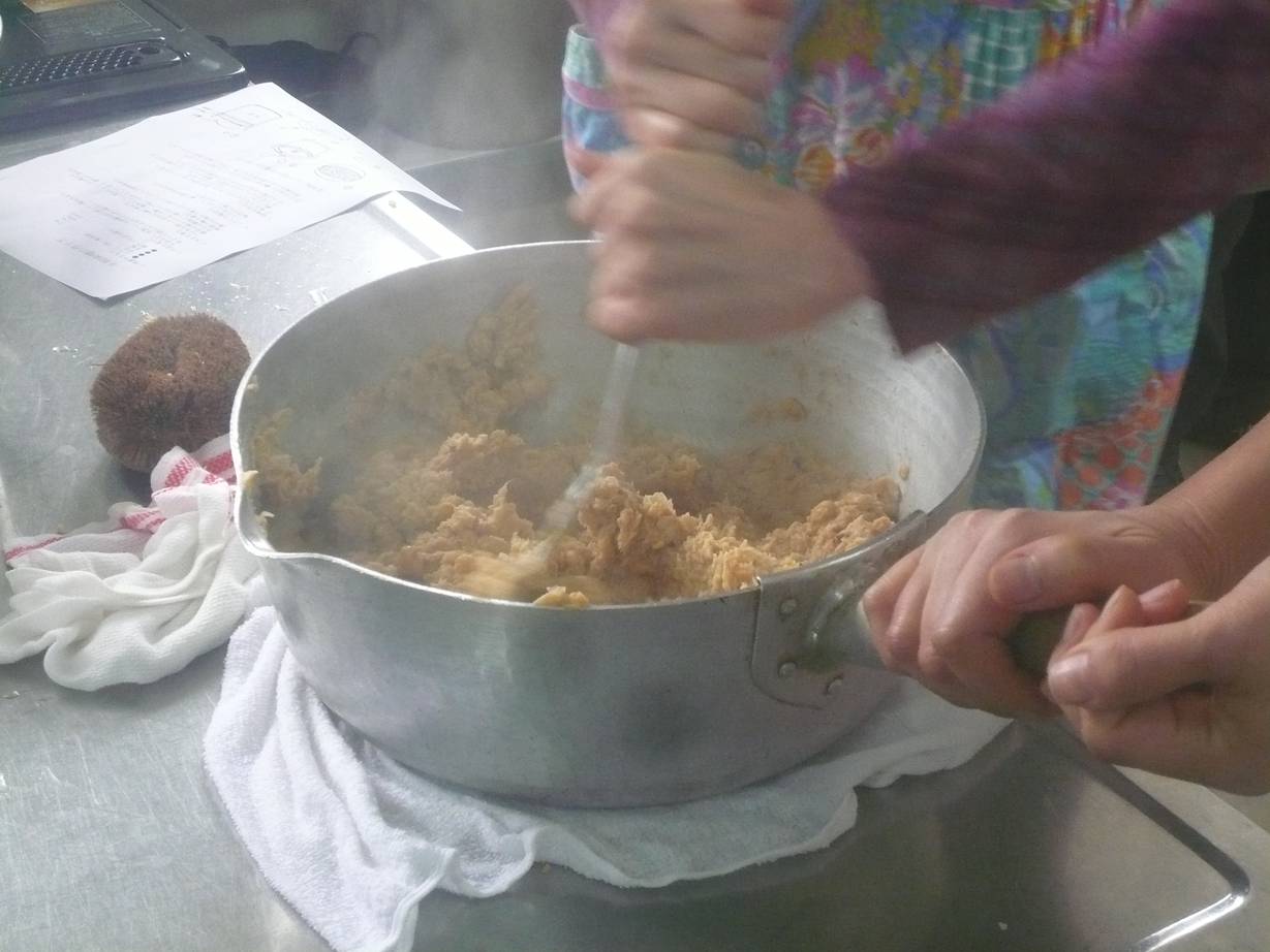 そして丸くこねた味噌をたたきつける。