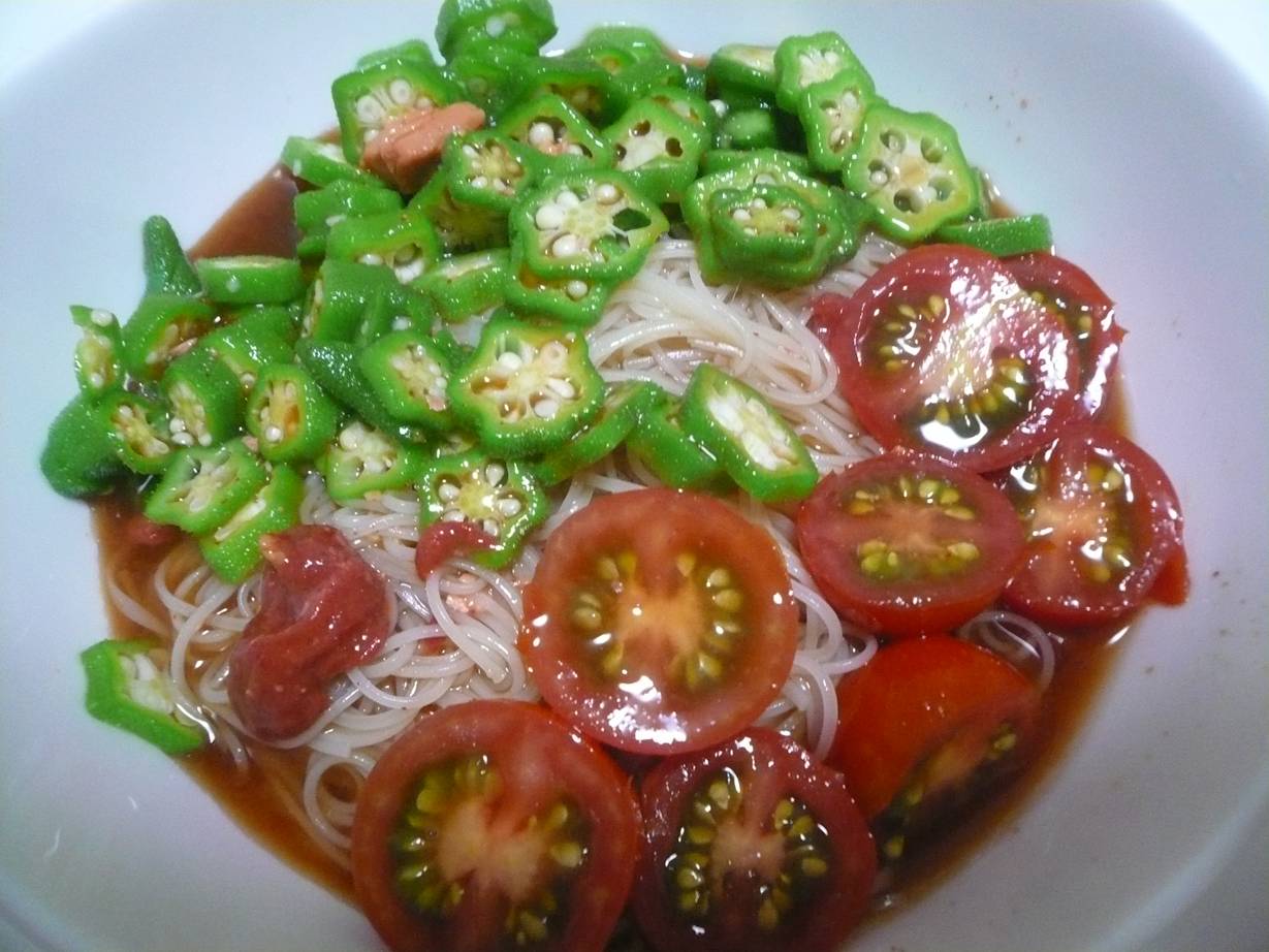 オクラとプチトマトを軽く茹でて乗せてツユをかけた。