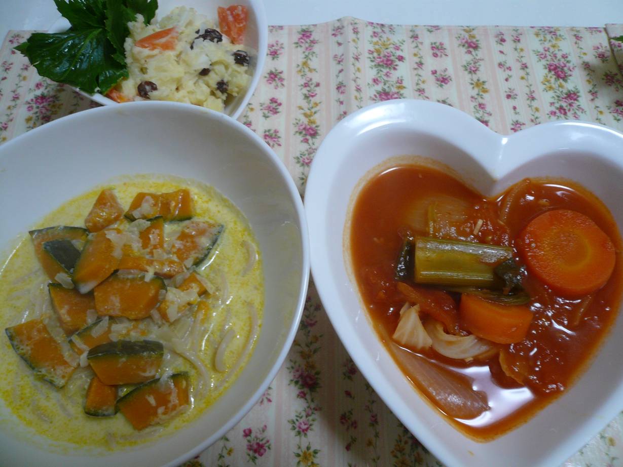 トマト煮込みとクリームスープパスタ。