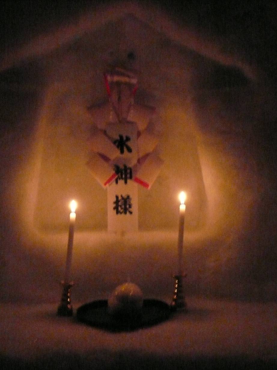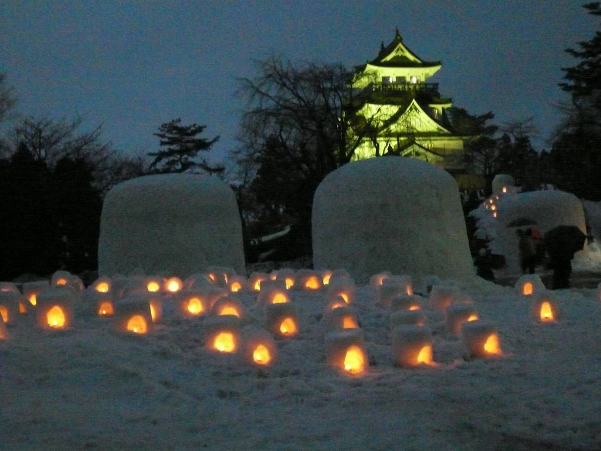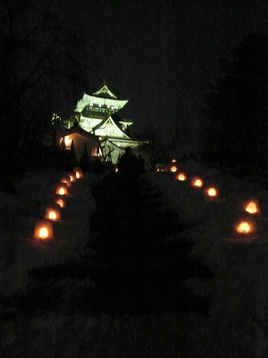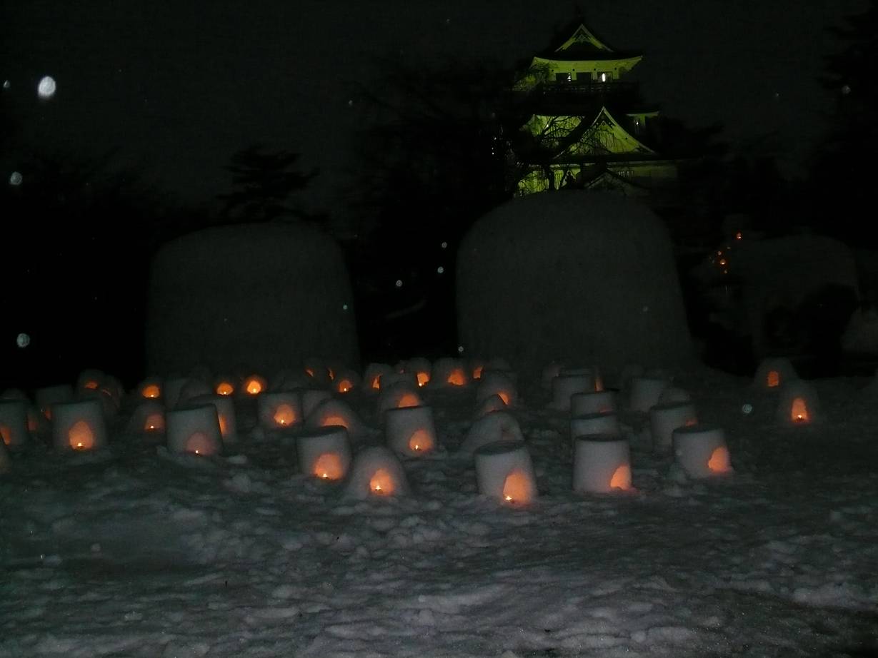 かまくらの光と(中に蝋燭がともってる)城のライトアップ、周りの透明な白い雪。