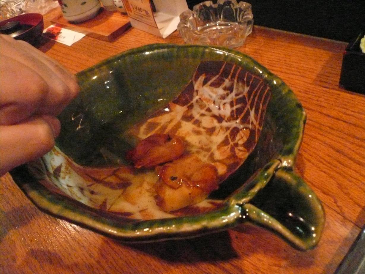これ、骨酒というよりトサカ酒で、要するに「比内地鶏の頭の部分をちょっと炙って、そこに日本酒の熱燗を注ぎ込み、ラップで蒸したもの」なんですね。