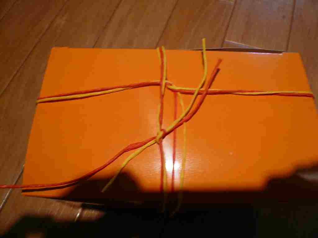 とりあえずお菓子を入れてみたのですが、紐の綺麗な結び方がわからずこんな感じに。