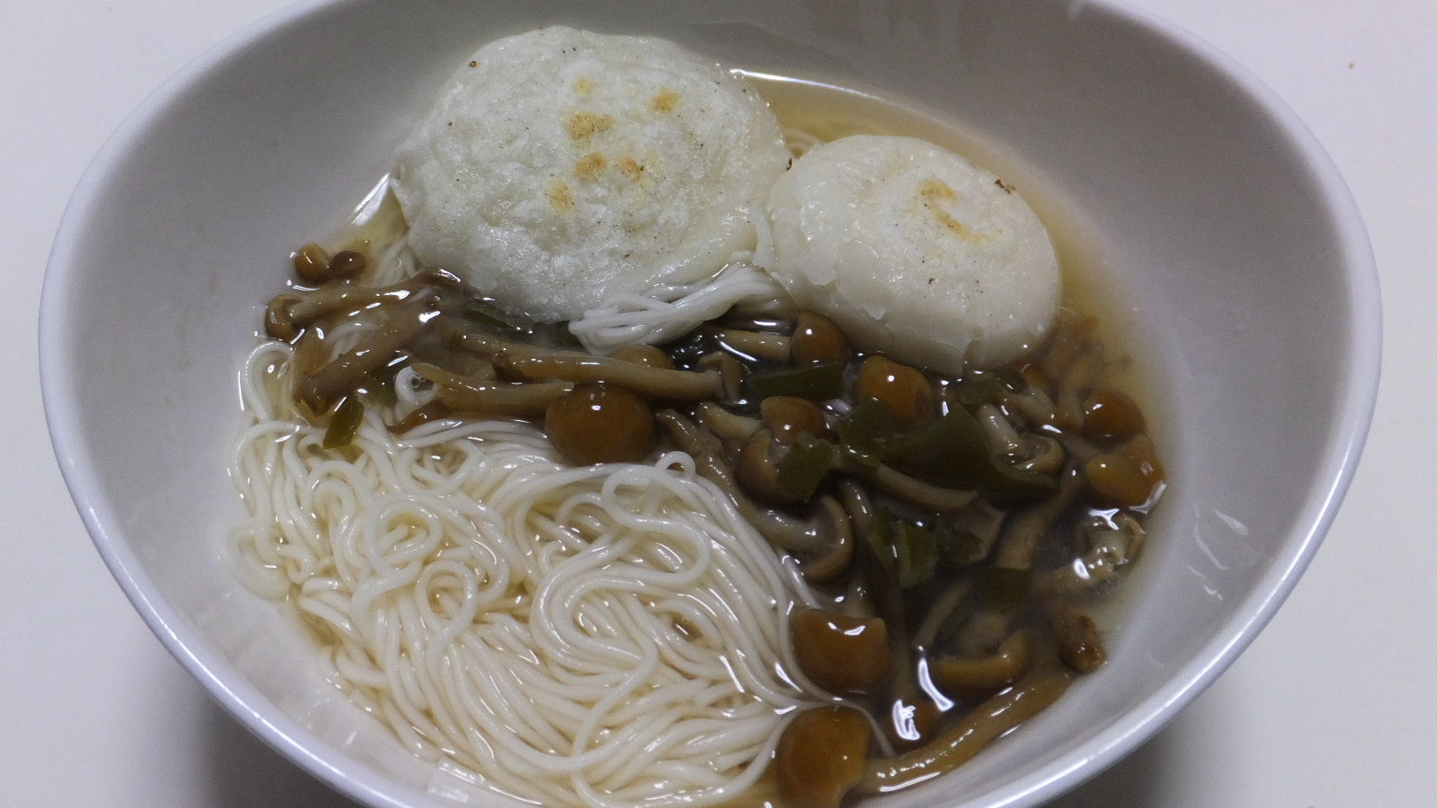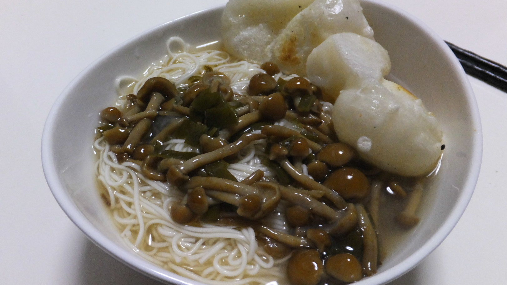 出汁に浸して餅を食べ、ナメコと共に食う。