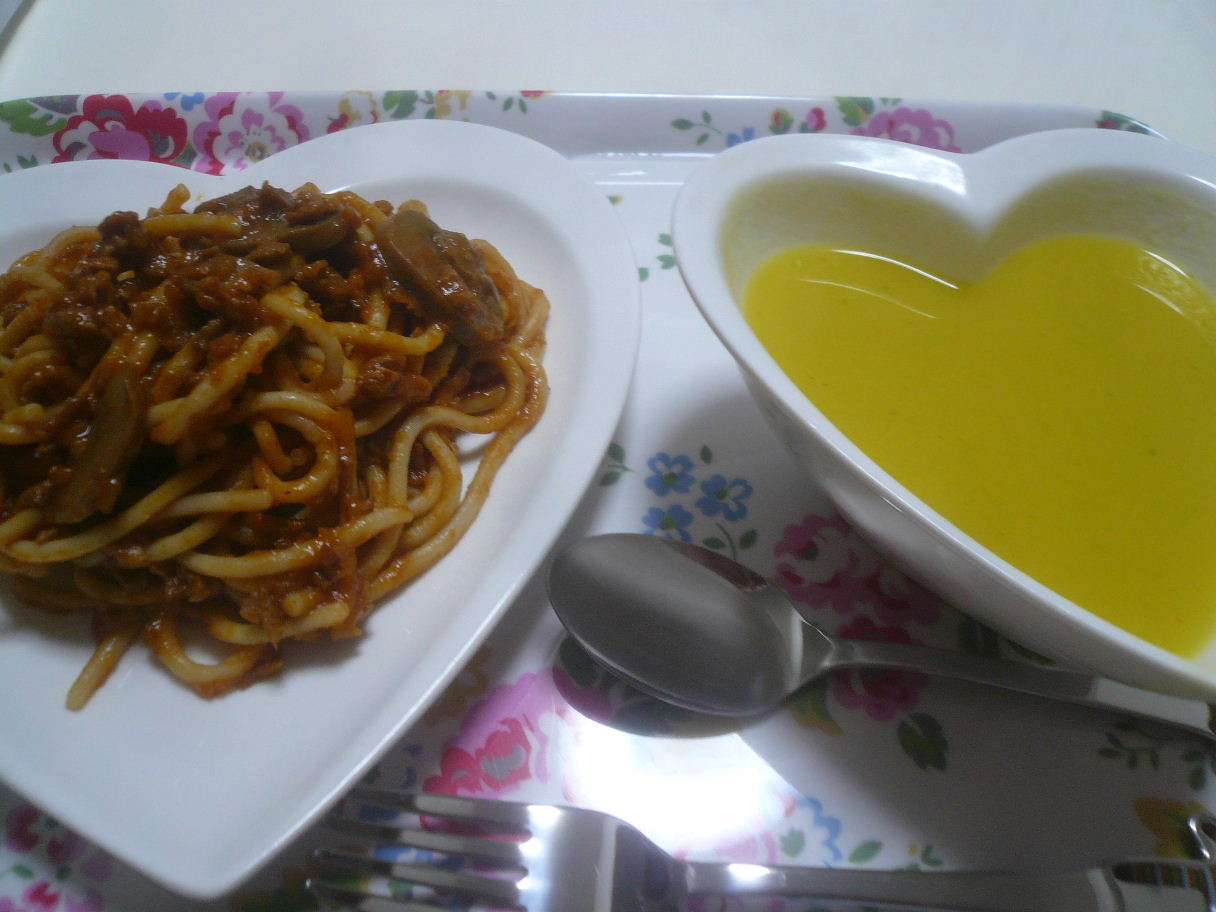 さて誕生日料理はミートスパゲティとコーンスープ。